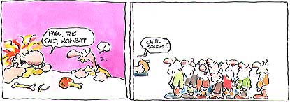 | Gryla kocht nur, wenn sie dazu Lust hat. Manchmal liegen hunderte von Jahren zwischen den Mahlzeiten. | Wenn sie kocht, dann mit solch einer Tatkraft, dass die Berge Feuer speien. Die Menschen nennen es einen Vulkanausbruch. |