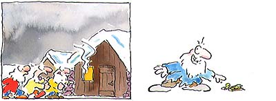 | Die Söhne entdecken das Essen, das die Menschen kochen, und sie lieben es. | Nach und nach beginnen sie, das Essen zu stehlen. |