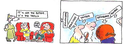 | Die Menschen entdecken die Existenz der Trolls und dass sie verantwortlich für das ganze verschwundene Essen sind. | Jeder Troll wird von den Menschen nach seinem Verhaltensmuster benannt. |