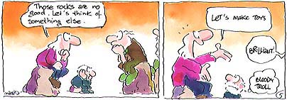 | Sie beschließen, dass sie statt Felsen Spielzeug machen könnten. |